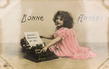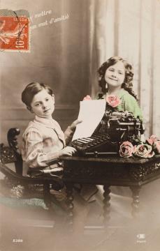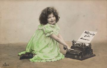 Illustrierte Postkarte; Fotografie, koloriert; Serie AE 2387/5 Rückseite: Mädchen am Boden sitzend mit Schreibmaschine; Briefmarke Postes Francaises 10c; Poststempel unleserlich Vorderseite: mit Schreibmaschine beschrieben, datiert 1.01.1908