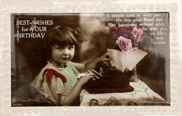 Illustrierte Postkarte; Fotografie, koloriert; Nr. 2233/2 Rückseite: Mädchen mit Schreibmaschine, Blick zum Betrachter, Glückwunschtext in Versform, dekorativer Rahmen mit Blumen in Blindprägung Vorderseite beschrieben und adressiert