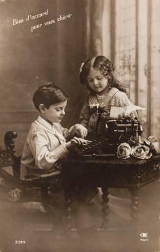 Illustrierte Postkarte; Fotografie, monochrom; Nr. 2389 Rückseite: Junge und Mädchen mit Schreibmaschine, Blumen als Dekoration Vorderseite: beschrieben und adressiert; Briefmarke Postes Belgique 5c; Poststempel Brussel/23 III 1912