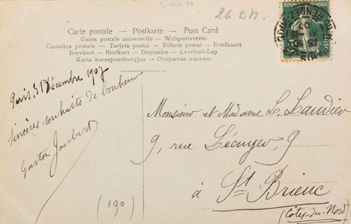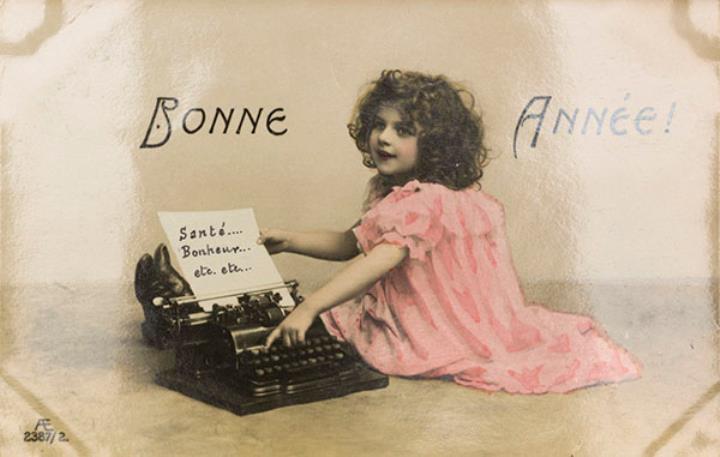Illustrierte Postkarte; Fotografie, koloriert; Serie AE 2387/2 Rückseite: Mädchen am Boden sitzend mit Schreibmaschine, Briefblatt beschrieben Vorderseite: beschrieben; adressiert an Monsieur Laudier, St. Brieuc; Briefmarke Postes Francaises 5c; Poststempel Paris/31 12 1907