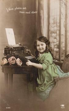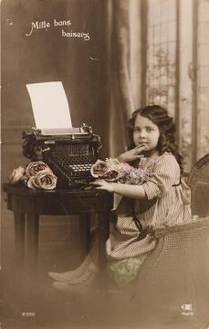 Illustrierte Postkarte; Fotografie, koloriert; Nr. 2390 Rückseite: Mädchen mit Schreibmaschine, Blick zum Betrachter, Blumen als Dekoration Vorderseite: beschrieben; adressiert an M.lle Ruelle, Charleroi; Briefmarke Belgique 5c; Poststempel Charleroy/27 V 1912