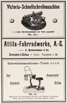 Werbeanzeige für Schreibmaschine Victoria, Attila Fahrradwerke und Schreibmaschinen-Tisch monochrom