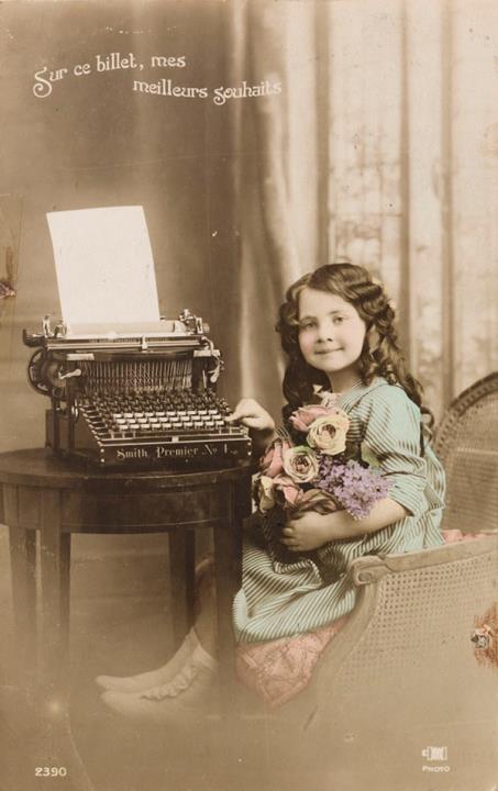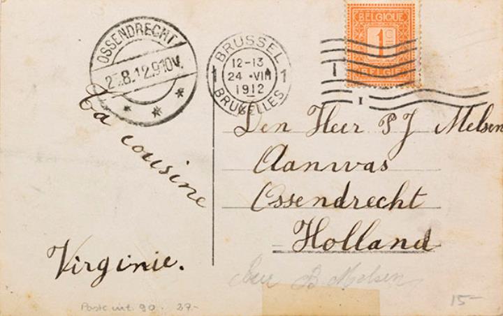 Illustrierte Postkarte; Fotografie, koloriert; Nr. 2390 Rückseite: Mädchen mit Schreibmaschine und Blumen, Blick zum Betrachter Vorderseite: beschrieben; adressiert an Heer Melsen, Ossendrecht; Briefmarke Belgique 1c; Poststempel Brussel/24 VIII 1912