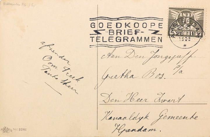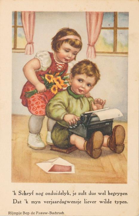 Illustrierte Postkarte; Grafik, polychrom; Nr: 3261 Rückseite: Mädchen mit Blumen und Junge mit Schreibmaschine, Text in Versform Vorderseite: beschrieben und adressiert; Briefmarke Nederland 1 1/2 Cent; Poststempel Amsterdam/25 II 1939(?)