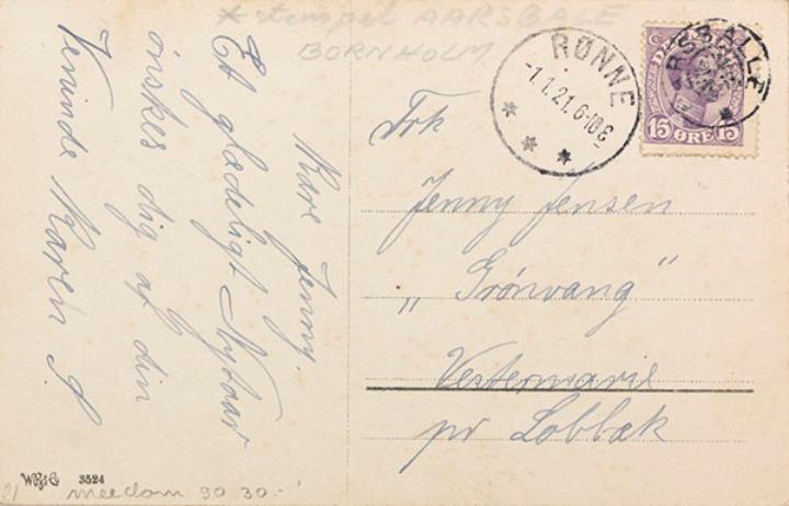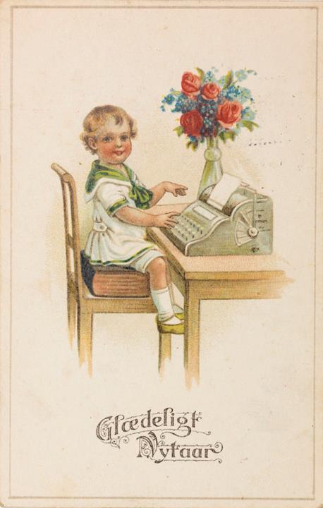 Illustrierte Postkarte; Grafik, polychrom; Nr. 3527 Rückseite: Kind mit Schreibmaschine und Blumen Vorderseite: beschrieben; adressiert an Fru Jensen, Vestermarie; Briefmarke Danmark 15 Øre; Poststempel Arsbale/Ronne/1.1.1921