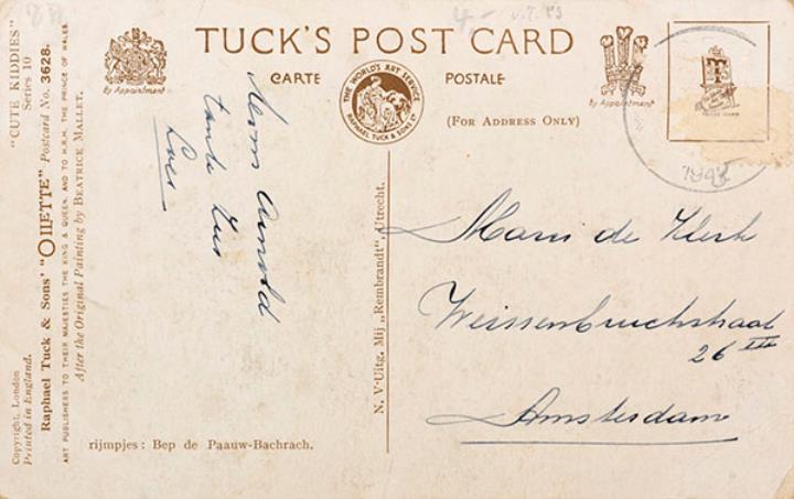 Illustrierte Postkarte; Grafik, polychrom Cute Kiddies Series 10 Nr. 3628; Grafik: Beatrice Mallét Rückseite: Mädchen mit Schreibmaschine Vorderseite: beschrieben und adressiert