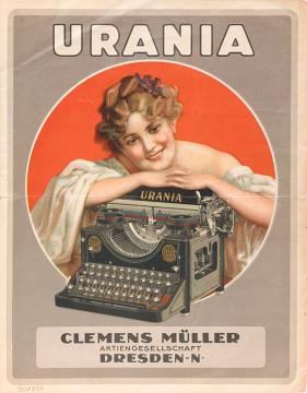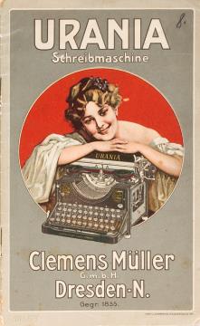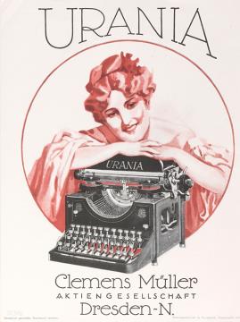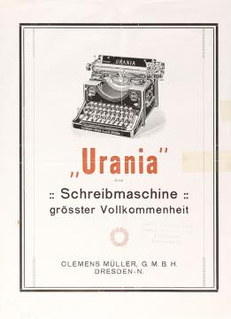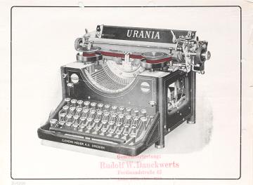 Prospekt für Schreibmaschine Urania angebrachter Stempel: Generalvertretung Rudolf W. Danckwerts, Alster