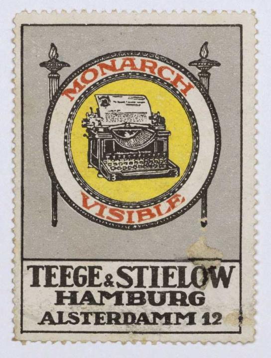 Reklamemarke/Werbemarke für Schreibmaschine Monarch; rechteckig, polychrom Text: Teege & Stielow Hamburg Alsterdamm 12