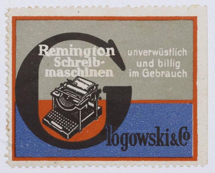 Reklamemarke/Werbemarke für Schreibmaschine Remington; rechteckig, polychrom Text: unverwüstlich und billig im Gebrauch