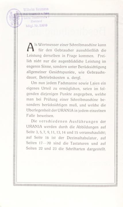 Next to literature on the history of technology, of the typewriter and the office, the Archive holds patent letters, textbooks and instruction manuals as well as historical postcards, letters, photographs and various kinds of advertising (leaflets and brochures, advertising stamps, newspaper ads, posters and signs, promotional gifts).