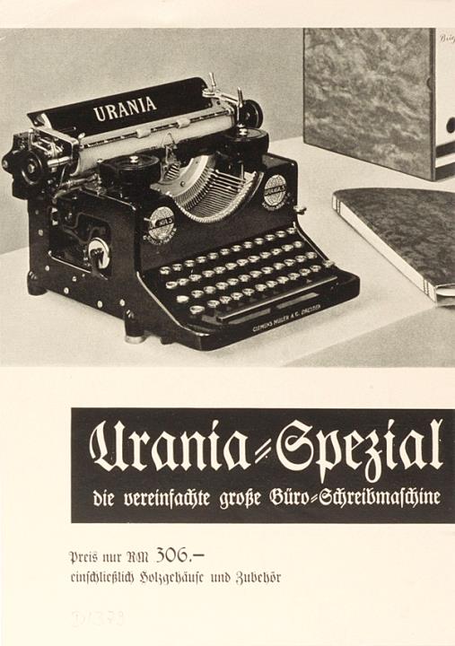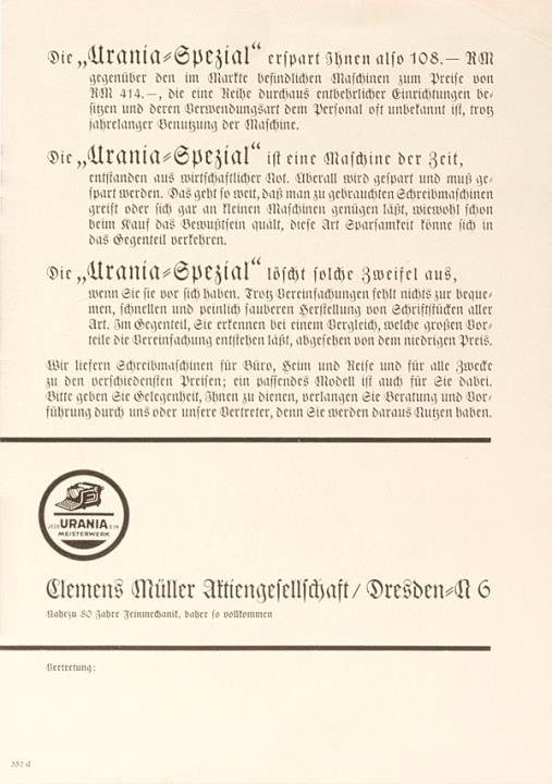 Prospekt für Schreibmaschine Urania Spezial die vereinfachte große Büro-Schreibmaschine Nr. 352d