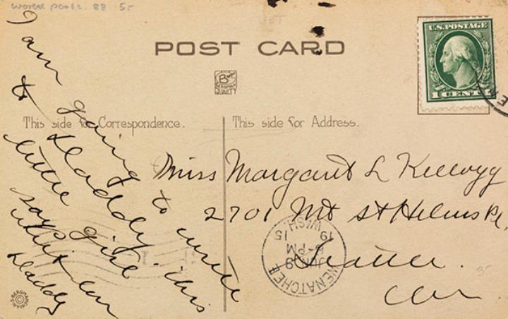 Illustrierte Postkarte; Grafik, polychrom Nr. 6502; copyright 1913 S. Bergman, NY Rückseite: Junge mit Schreibmaschine, Briefblatt mit Text, Kartusche mit Kuss-Szene Vorderseite: beschrieben; adressiert an Miss Kellogg, Seattle; Briefmarke U.S. Postage 1 Cent; Poststempel Wenatchee/Jun 9 1915