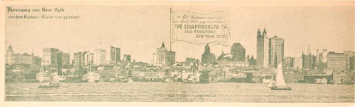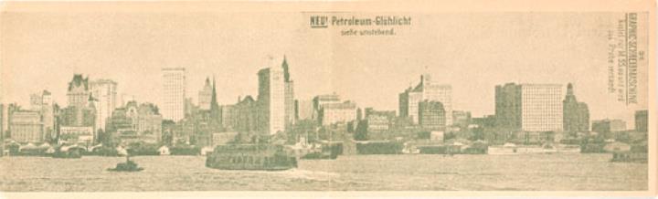 Leporello-Reklamekarte von Hermann Hurwitz & Co. Berlin, Fachhandel für Druckapparate und technische Geräte mit Stadtansicht von New York und mehrseitiger Werbung, u.a. zur Schreibmaschine Graphic