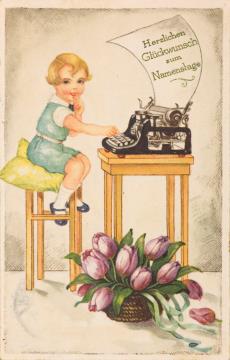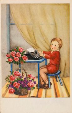 Illustrierte Postkarte; Grafik, polychrom; Nr. 7926 Rückseite: Junge mit Schreibmaschine und Blumen Vorderseite nicht beschrieben