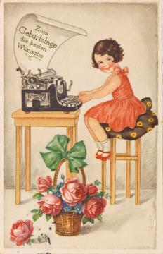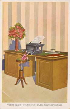 Illustrierte Postkarte; Grafik, polychrom; BR Nr. 9386 Rückseite: Mädchen mit Schreibmaschine und Blumen Vorderseite: beschrieben; adressiert an Fräulein Rummel, Augsburg; Briefmarke Deutsches Reich 6 RPf.; Poststempel Hamburg/20.xx.1935
