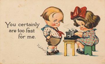Illustrierte Postkarte; Grafik, polychrom Grafik: Twelvetree; copyright 1916 S. Bergman, NY Rückseite: Junge und Mädchen mit Schreibmaschine Vorderseite beschrieben