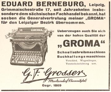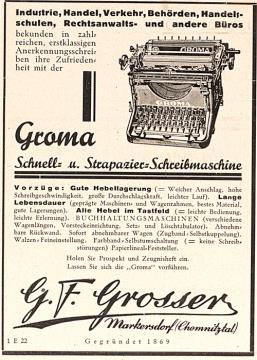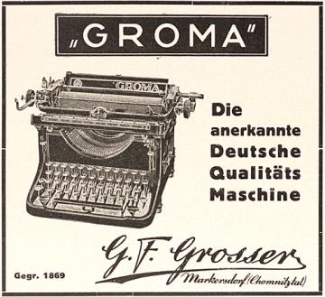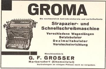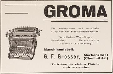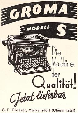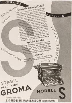Werbeanzeige für Schreibmaschine Groma monochrom