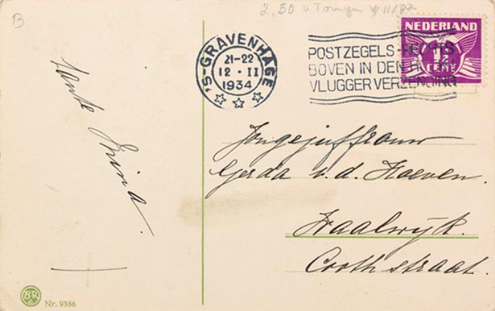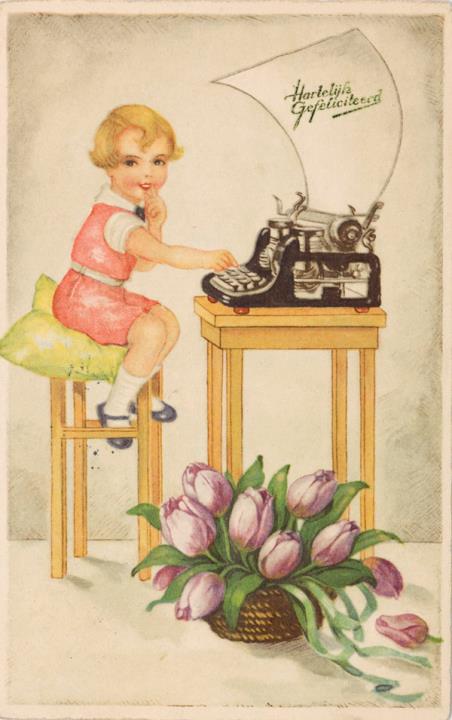 Illustrierte Postkarte; Grafik, polychrom; BR Nr. 9386 Rückseite: Junge mit Schreibmaschine und Blumen Vorderseite: beschrieben und adressiert; Briefmarke Nederland 1 1/2 Cent; Poststempel Gravenhage/12 II 1934