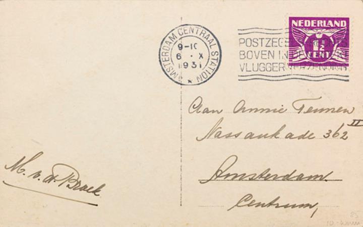 Illustrierte Postkarte; Fotografie, koloriert; Serie Amag 64465/1 Rückseite: Mädchen mit Schreibmaschine Vorderseite: beschrieben; adressiert an Annie Temen, Amsterdam; Briefmarke Nederland 1 1/2 Cent; Poststempel Amsterdam/6 X 1931