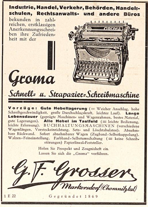 Werbeanzeige für Schreibmaschine Groma monochrom
