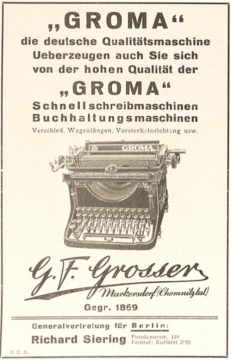 Werbeanzeige für Schreibmaschine Groma monochrom