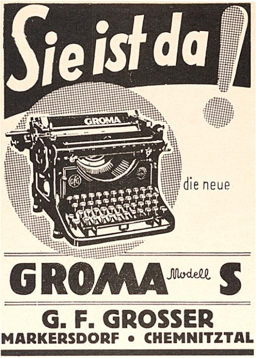 Werbeanzeige für Schreibmaschine Groma monochrom