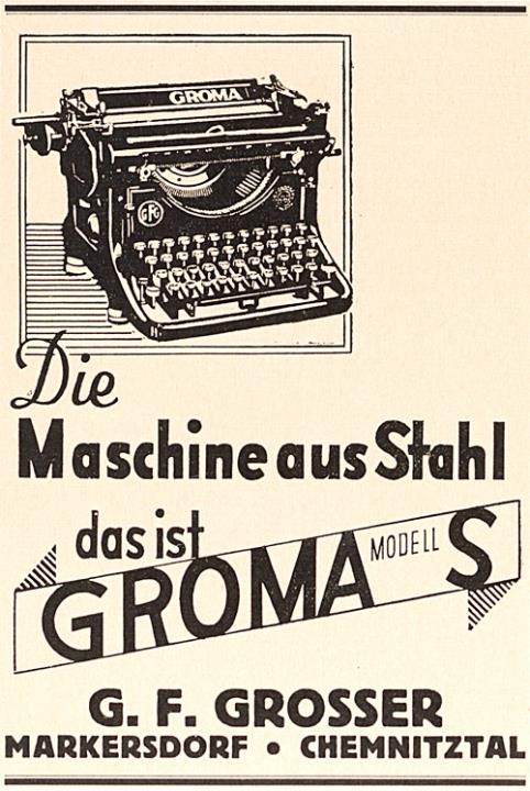 Werbeanzeige für Schreibmaschine Groma monochrom
