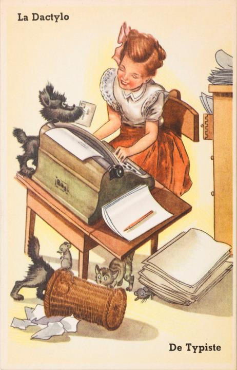 Illustrierte Postkarte; Grafik, polychrom Rückseite: Mädchen mit Schreibmaschine Vorderseite nicht beschrieben