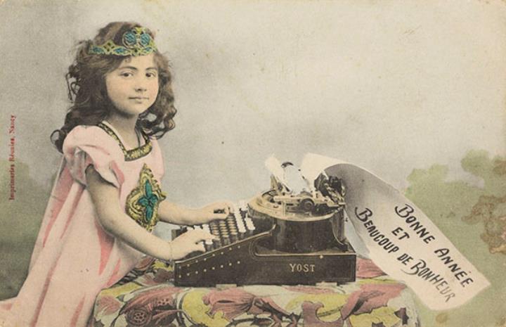 Illustrierte Postkarte; Fotografie, koloriert Rückseite: Mädchen mit Schreibmaschine Yost Vorderseite beschrieben