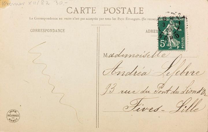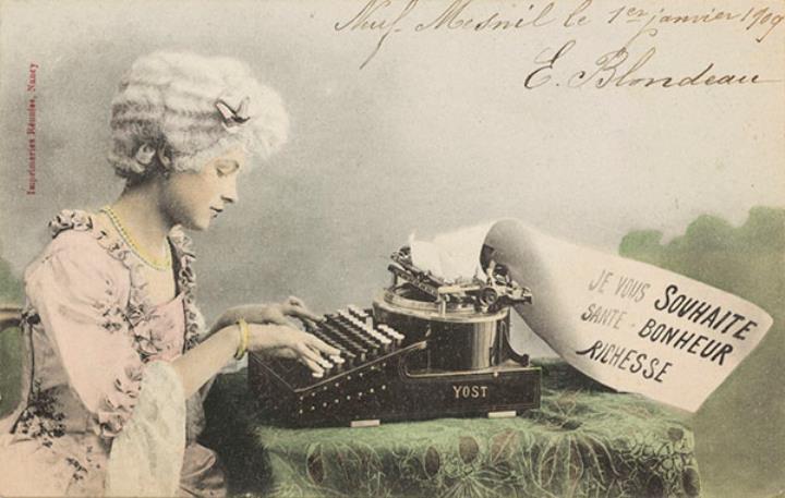Illustrierte Postkarte; Fotografie, koloriert Rückseite: Mädchen im Kostüm (Rokoko) mit Schreibmaschine Yost; beschrieben Vorderseite: adressiert an Mademoiselle Lefebre, Lille; Briefmarke Postes Francaises 5c; Poststempel 3-I 1909