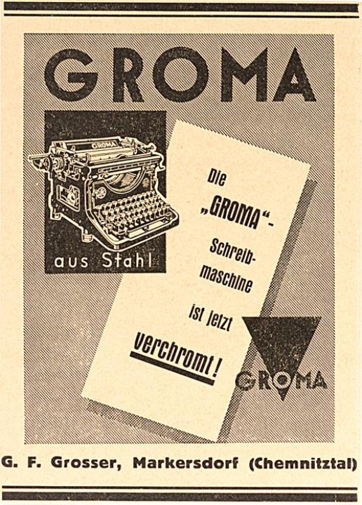 Werbeanzeige für Schreibmaschine Groma monochrom
