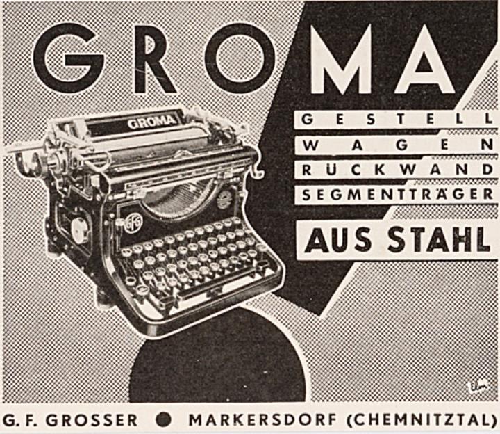 Werbeanzeige für Schreibmaschine Groma monochrom Grafik: Elm