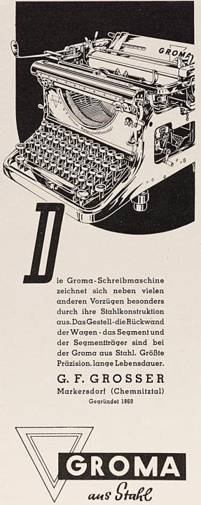 Werbeanzeige für Schreibmaschine Groma monochrom