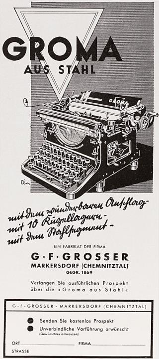 Werbeanzeige für Schreibmaschine Groma monochrom