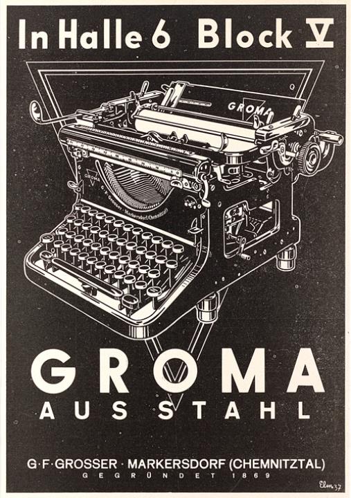 Werbeanzeige für Schreibmaschine Groma monochrom Grafik: Elm