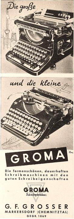 Werbeanzeige für Schreibmaschine Groma monochrom Grafik: Elm
