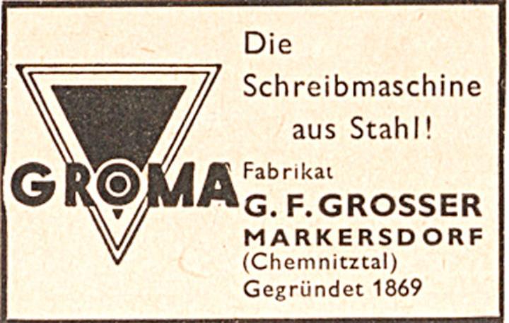Werbeanzeige für Schreibmaschine Groma monochrom