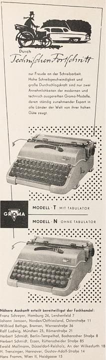 Werbeanzeige für Schreibmaschine Groma T und Groma N monochrom