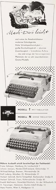 Werbeanzeige für Schreibmaschine Groma T und Groma N monochrom