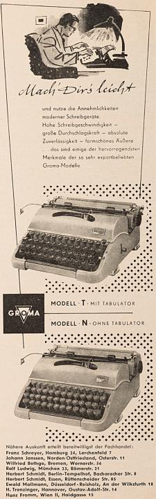 Werbeanzeige für Schreibmaschine Groma T und Groma N monochrom