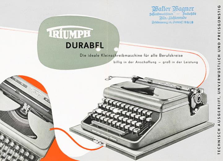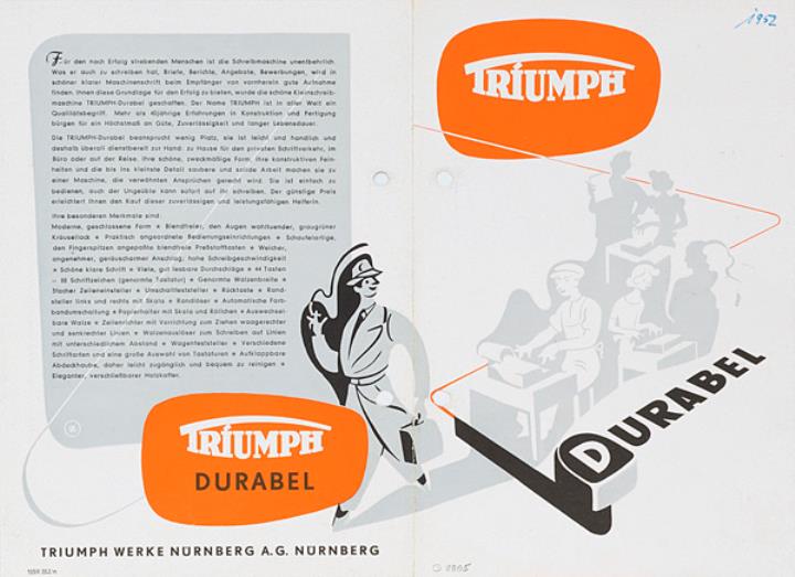 Faltprospekt für tragbare Schreibmaschine Triumph technisch ausgereift, unverwüstlich und preisgünstig Nr. 1059/352/n Datum handschriftlich vermerkt
