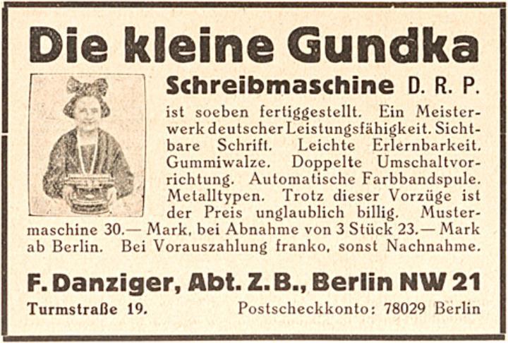 Werbeanzeige für Schreibmaschine Gundka monochrom