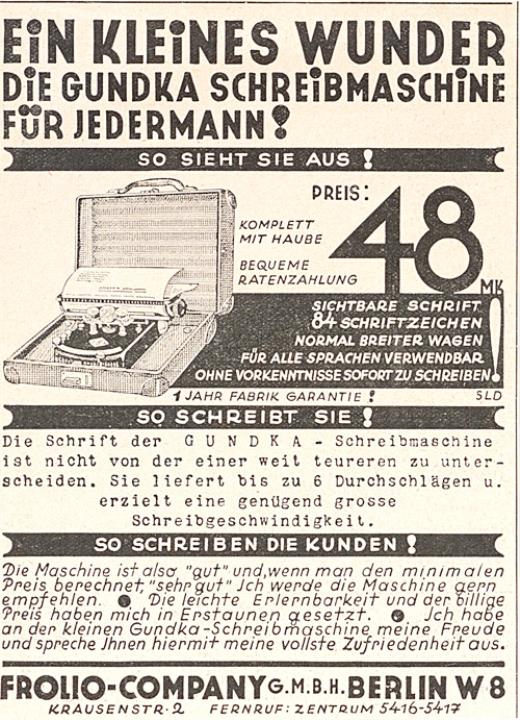 Werbeanzeige für Schreibmaschine Gundka monochrom
