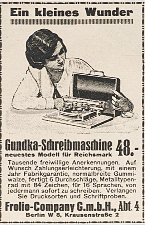 Werbeanzeige für Schreibmaschine Gundka monochrom