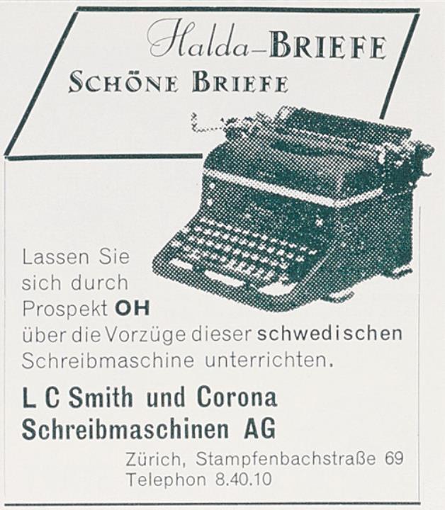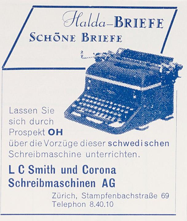 Werbeanzeige für Schreibmaschine Halda monochrom, zwei Exemplare (blau und grün)
