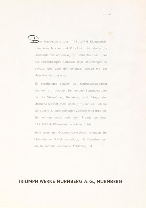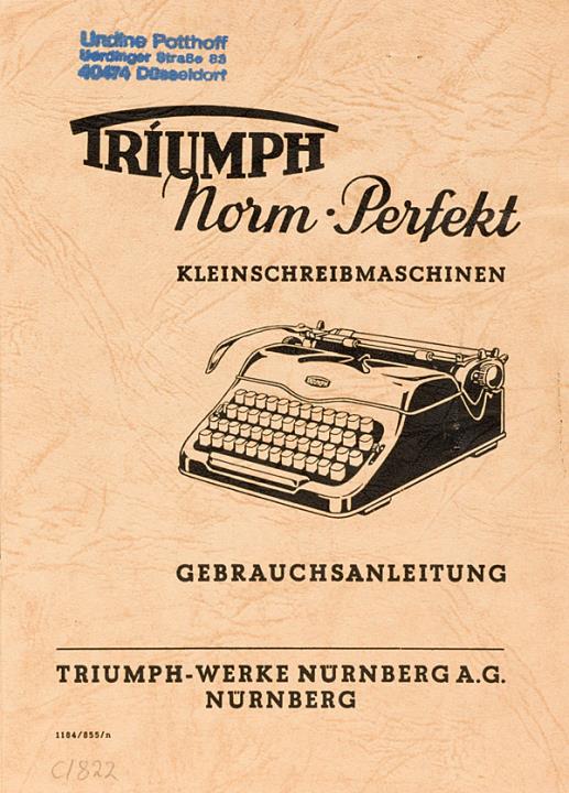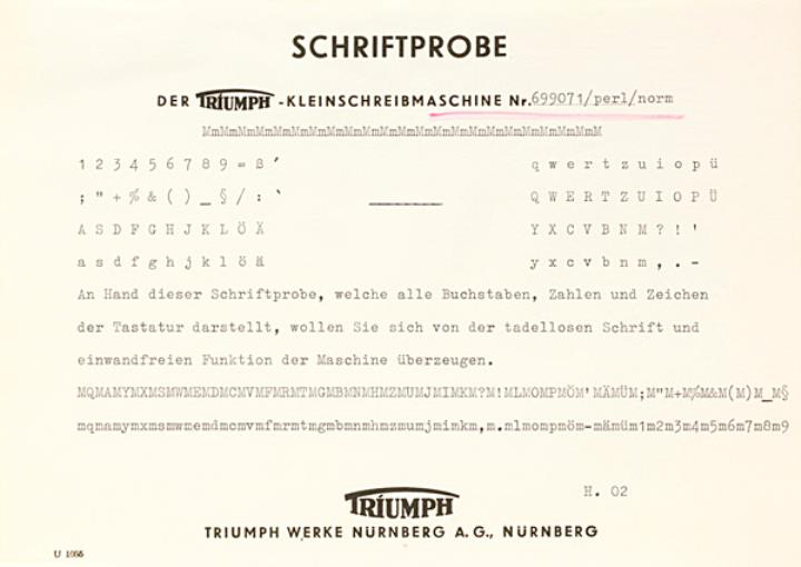 Bedienungsanleitung für Schreibmaschine Triumph Perfekt und Norm; Nr. 1184/855/n Beilagenblatt: Schriftprobe der Triumph Nr. 699071/perl/norm; Nr. U1055