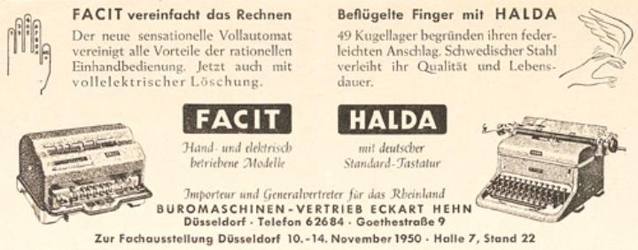 Werbeanzeige für Rechenmaschine Facit und Schreibmaschine Halda monochrom