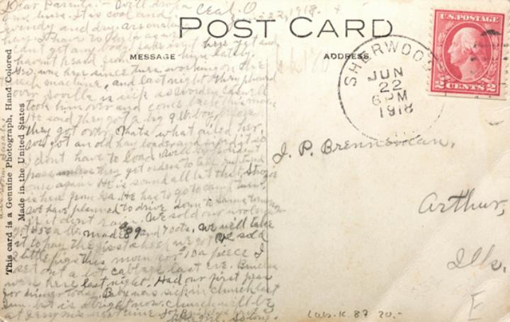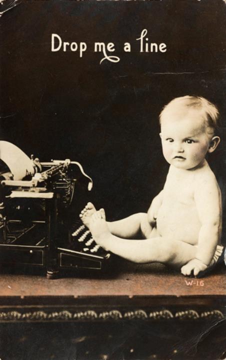 Illustrierte Postkarte; Fotografie, koloriert; Nr. W-16 Rückseite: Baby mit Schreibmaschine Vorderseite: beschrieben und adressiert; Briefmarke U.S. Postage 2 Cents; Poststempel Sherwood/Jun 22 1918