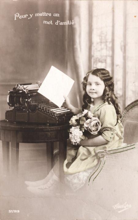 Illustrierte Postkarte; Fotografie, koloriert; Nr. Se./213 Rückseite: Mädchen mit Schreibmaschine und Blumen, Blick zum Betrachter Vorderseite: beschrieben; adressiert an Mejuffer Hegers, Turnhout; Briefmarke Postes Belgique 1c; Poststempel Anvers/28 IX 1912