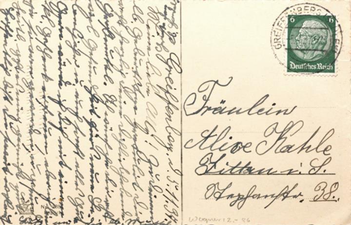 Illustrierte Postkarte; Fotografie, monochrom; Nr. 2881 Rückseite: Mädchen mit Schreibmaschine, Glückwunschtext in Versform Vorderseite: beschrieben; adressiert an Fräulein Kahle, Zittau; Briefmarke Deutsches Reich 6 RPf.; Poststempel Greiffenberg/5.11.1937